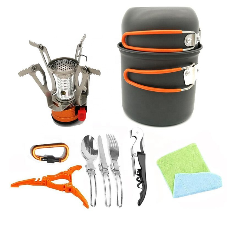 ກະເປົາເດີນທາງແບບກາງແຈ້ງແບບ Portable Cookware Cookware Cookware Cookware. ຊຸດປຸງແຕ່ງເຄື່ອງຈັກຜະລິດຕະພັນຮ້ອນນີ້ຖືກອອກແບບມາສໍາລັບການຕັ້ງຄ້າຍພັກຜ່ອນແລະການເດີນທາງໄປທ່ຽວຊົມ 1-2. ດີເລີດສໍາລັບການກະກຽມແລະການກຽມພ້ອມສຸກເສີນ, ມັນປະສົມປະສານເຄື່ອງມືປຸງແຕ່ງອາຫານທີ່ຈໍາເປັນດ້ວຍການຫມູນວຽນສູງສຸດ.